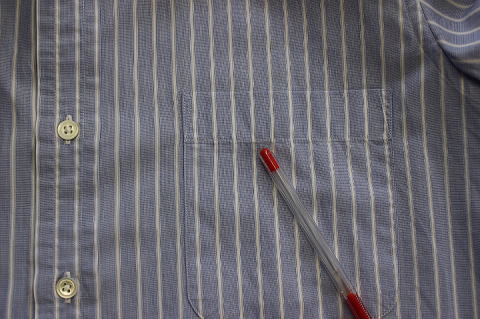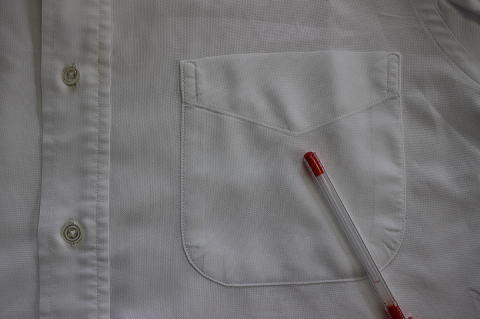 | 「胸ポケット口のすり切れ修理が出来ないシャツ」 下記画像の赤ペン先のように、 「ポケット口の下から2〜3cm下がったミシンステッチが胸ポケット口と平行でないシャツ」 (画像は、ブイのように曲げてミシンステッチしてあります。) の場合は修理が出来ません。。 |